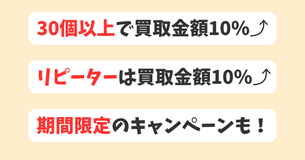 一度に30個以上のグッズを売却すると、買取金額を10%アップしてくれるキャンペーンがあります。