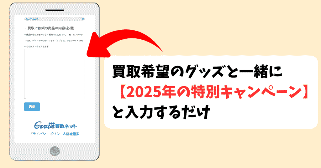 ディズニーグッズの査定の申し込みの際に【2025年の特別キャンペーン】と入力してください。