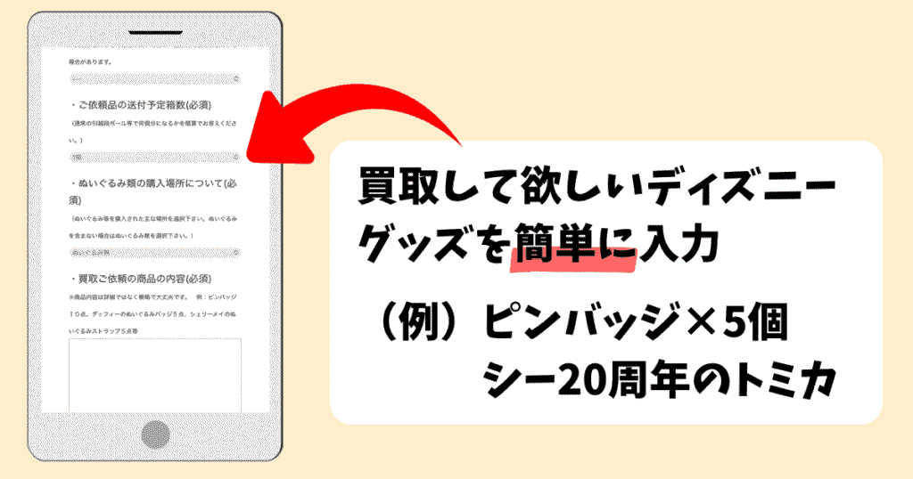 買取希望のディズニーグッズの内容と合わせて、【2025年の特別キャンペーン】と入力すれば特別キャンペーンが利用できます。