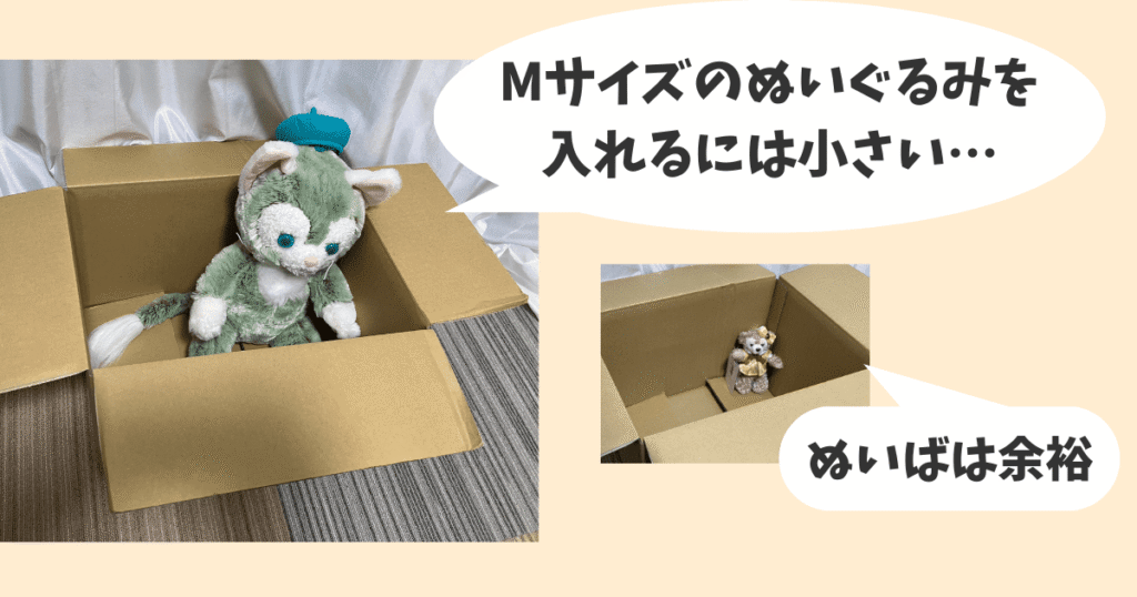 我が家は保管していたディズニーグッズの数が少なかったのでの、小型の段ボールがぴったりサイズでした。