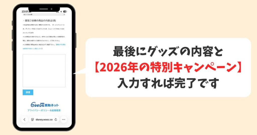 買取希望のディズニーグッズの内容と合わせて、【2026年の特別キャンペーン】と入力すれば特別キャンペーンが利用できます。