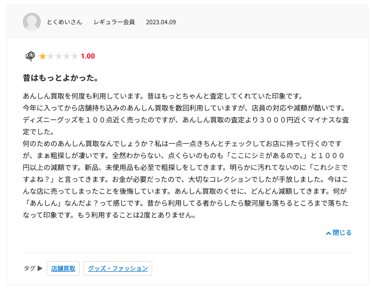 しかし実際の買取金額が査定額よりもかなり低かったという口コミです。